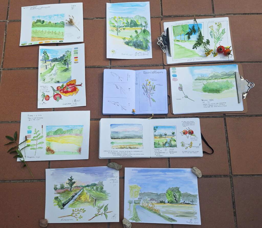 Onlangs was er bij Op een Blaadje in samenwerking met Mirja Brandorff van Nature Art een natuurjournalen tweedaagse. Twee dagen waarin 8 cursisten leerden hoe je een natuurjournaal kunt maken. Dat deden we door waar te nemen. Door te kijken naar de natuur voor je voeten, de natuur voorhanden. Wat zie je, wat ruik je, wat doet de wind, en de zon? Hoe zet je dat op papier, die totaalervaring van wat de natuur op dat moment laat zien?